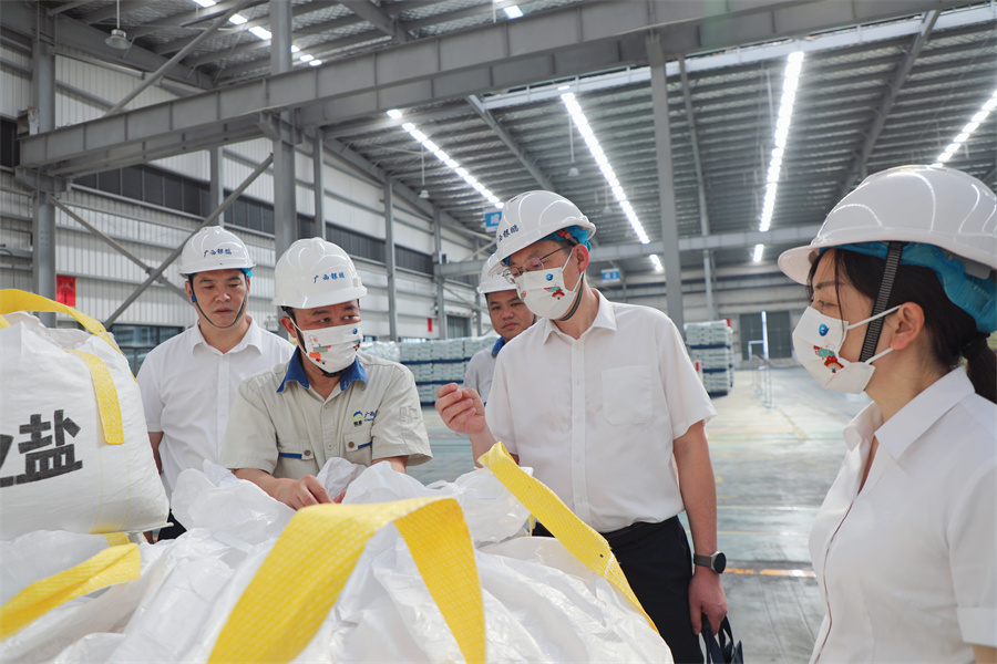 廣西鹽業(yè)集團南寧分公司,邱潮涌仔細(xì)檢查鹽品倉儲、政府儲備鹽、鐵路專用線及辦公場所等重點區(qū)域,并對鹽品堆疊、叉車使用、配送車輛安全及極端天氣災(zāi)害防范等工作進(jìn)行了現(xiàn)場指導(dǎo)。