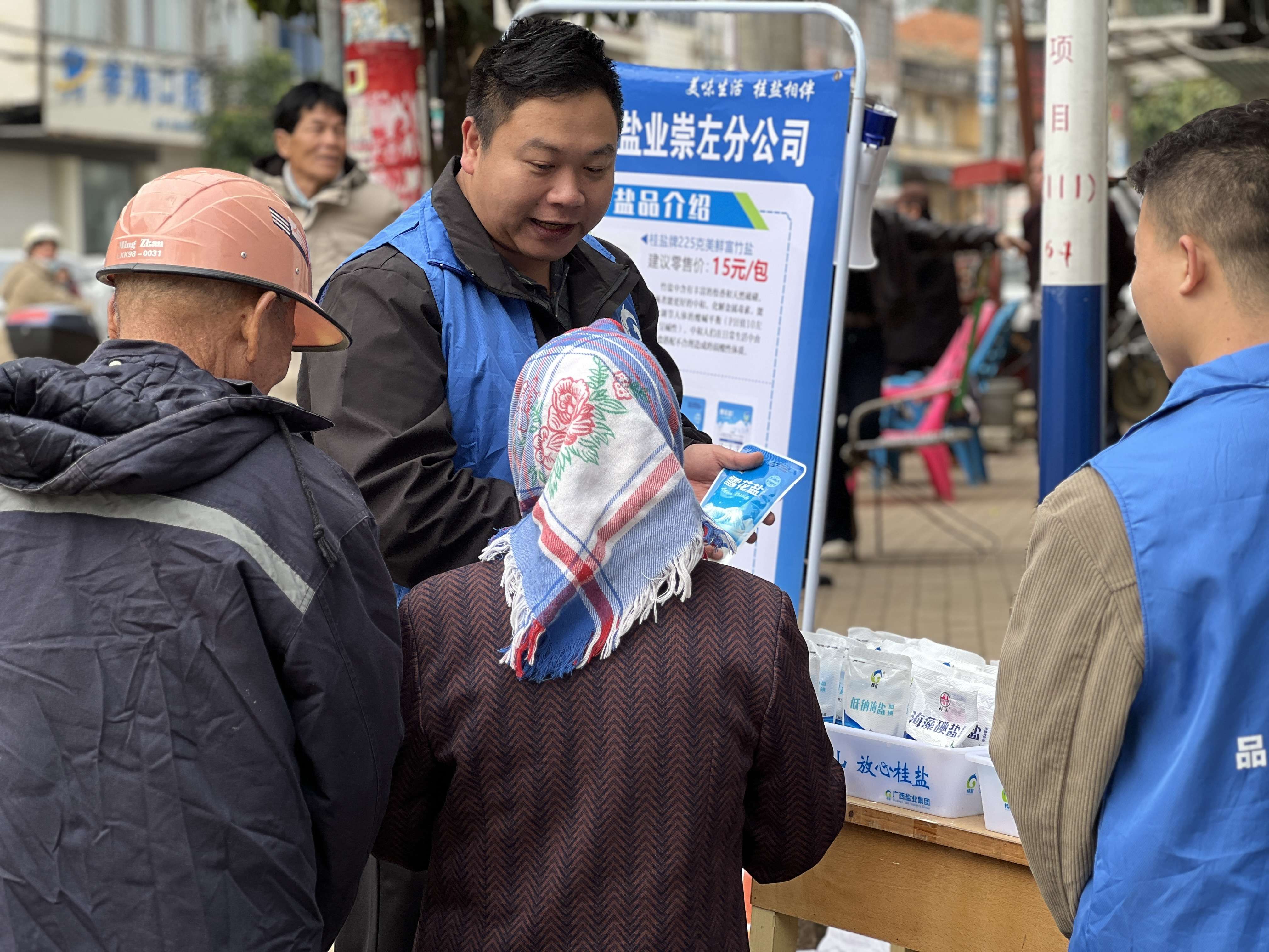 搶花炮決賽后,廣西鹽業集團崇左分公司巧妙地在巡游的必經之路上擺攤設點開展地推活動,借著熱鬧的人流,讓四方聞訊而來的民眾在沉浸式體驗民族傳統節日魅力的同時,還能深入了解健康用鹽知識,進一步了解“桂鹽”“桂山”品牌。